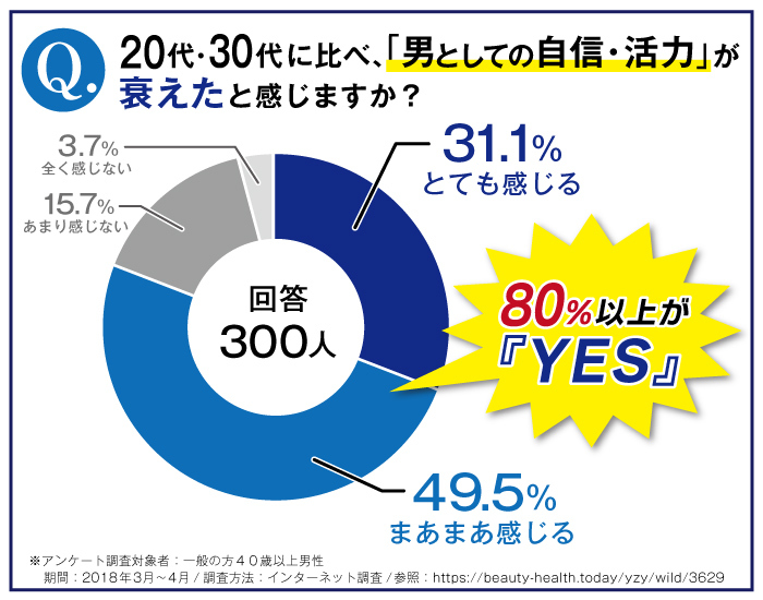 などなど、加齢によって男としての活力が衰えたと感じる人は80%以上もいるようだ。